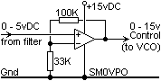 The 100K resistor will give the Op-Amp a gain of 2 with 5v DC input, but a gain of only 1.2 at 1v DC input. This gives us an output voltage swing of 0v DC to 10v DC. 150K would give up to 15v. Select the resistor for the maximum voltage you need to drive your varicap diode. You will, of course, need at least this voltage to power the Op-Amp.