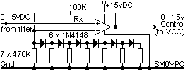Remember too, diodes do not switch instantly, they conduct slowly between 0.62v and about 0.72v. This "softness" helps to smooth the curve out so there are no well defined gain switchover points. Now, our voltage to frequency translation will be more constant over the range of 0-5v from the loop filter, so the overall loop gain will become more constant, making the filter damping correct over the whole VCO frequency range.