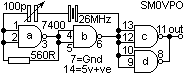 I am going to begin with a 26MHz TTL crystal square-wave oscillator. This could be either a TTL chip or a crystal module. I prefer the crystal module since these have a small frequency adjustment by voltage, and they do not require any assembly, just a little superglue so they have their legs in the air to form suitable anchoring points for other components.