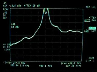 The chosen method of construction was the so called "ugly-bug" ("rats-nest" in English), mainly because a PCB does not really suit this project - there are so many mechanical considerations. As you can see in the photograph I have placed a shield between the two inductors. I will shortly place an aluminium shield over the whole assembly, but this will affect the coupling between the two resonators. Ah!!! Coupling, that is a good word. The two resonators are separated by about 60mm. This and the shield between them reduces the coupling so that we can have a decent response and filter out adjacent frequencies. At first sight it would perhaps seem logical to place them closer together to get a better coupling - not so! If there is too much coupling then the passband widens quite considerably. To the left is a view of the spectrum analyser when the two resonators are just 15mm apart, to the right is the actual response I want (almost):