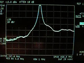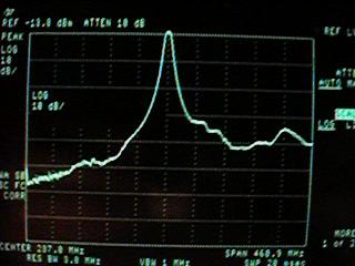 Coupling will be even further reduced when the tin-lid (aluminium) screen is fitted to give a response more like the one shown below-left, where the last remaining double-peak has almost dissapeared. Do not worry about the high base level only 30-40dB down on the peak in these photographs, this is due to stray coupling between my tracking generator and the analyser input. I am too mean to cut short my coaxial test leads for just three photographs. Sorry. When passing the original 26MHz (plus harmonics) through the filter, we finish with a signal like the one below right. As you can see, the unwanted signals are about 50dB down on the 130MHz desired signal.