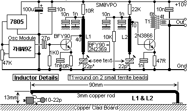 Here is an easy-build high-performance VHF (or UHF?) local oscillator. There are no PCB foil drawings to play with and no coils to wind. There are two 90mm long copper wire inductors needed, but the good news is, you dont have to wind them. The first unit makes an excellent 10mW (+10dBm) exciter to drive a VHF power amplifier and you have an FM transmitter that spans typically 12 consecutive channels in the 144MHz band, or one WBFM (88-108MHz band) channel. It also makes a great Local Oscillator for a VHF receiver. It can be built for almost any frequency range, from about 30MHz to probably much more than 200MHz, and it is crystal stable.