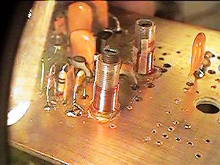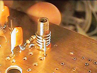 The completed former and VHF coil can then be fitted to the PCB. Note that I usually use double sided PCBs for VHF work and countersink the upper "gound" plane when a component lead is not to be soldered to earth.