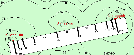 Take a good scale map showing height contours and lay a strip of paper on the route between Kukton Hill and Llareggub. Mark the paper with the height contours on the map as shown below. Here I have simplified the map considerably, but it shows clearly the two hills of Kukton Hill and Llareggub with Snoppton somwhere in the middle.