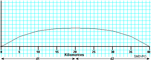 Now we must add the height information from the strip of the map we have marked from the map. You can lay the strip at 45 degrees so 0Km on both strip and graph are in contact. Connect the 40km mark of the strip to the 40km graph using a ruler and by keeping the ruler at the same angle you can mark all the points of the contour. The object is to get a graph like this showing a true profile of the contour of the Earth as the antennas see it.
