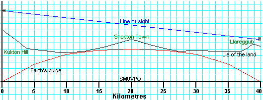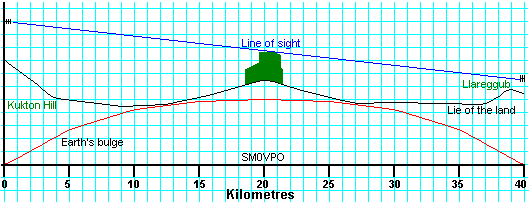 My example transmitter has an output power of 100mW and will be mounted on Kukton Hill and supported on a 30-metre tall mast. The transmitter uses an 8-element yagi having a gain of +8dB and is fed with 40 metres of UR76 coaxial cable having a loss of 4dB. The receiver is located on a small hillock at the North side of Llareggub and has a sensitivity of 1.0uV (-107dBm) for 20dB quieting (it's a brilliant receiver - built it myself!). The colinear antenna having a gain of 5dB is mounted on a 10-metre mast. 15 metres of UR76 coaxial cable, having a loss of 3dB, is used to couple the antenna to the receiver. Note that the cable losses quoted include losses of 0.3dB for each connector used. The distance between the Llareggub and Kukton Hill sites is exactly 40Km (26 miles). The transmitter frequency is 144.950MHz.