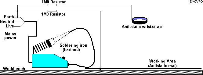 Many people believe that you can lay a bit of aluminium foil on the workbench and connect it to ground, along with the soldering iron and everything else in sight. Yes you can do this, BUT it must be connected to ground via a 1M0 resistor (brown-black-green). If not, then should you be in contact with the foil and you touch a live wire, then you will suffer a higher current-flow to ground through your body. According to Ohms law, current is directly proportional to the applied voltage, but in opposite proportion to the resistance of the conductor. The resistor therefore reduces the current to a safe level. One million Ohms is the usual value accepted for the electronic workbench.