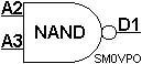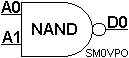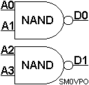 In this example A0 and A1 are the inputs to the NAND gate and D0 is the output terminal. Note that the right-hand binary digit is the least significant digit and the numerical values will be given in Hexadecimal. As you can see, there are four combinations. Now let us add another NAND gate to the same EPROM: