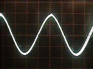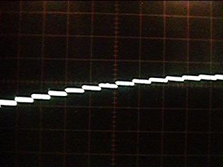 The EPROM and Divider combination therefore divides the VCO frequency by 128 to give us a frequency range of 50Hz to 1000Hz. The 3n3 capacitor at the output of the R2R ladder smoothes the output a little, otherwise the sine-wave would have steps looking like this: