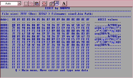 I have calculated the values you need for a Sine-Waveform and below you can see the screen-capture from my EEDIT program. Here you can download the SINE2.BIN file I created to blow the EPROM (epromosc.zip) and open it with my E-EDIT.EXE program.