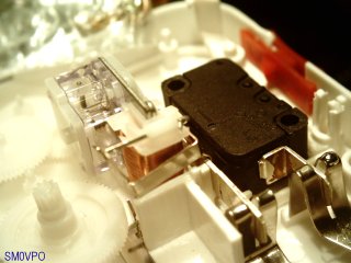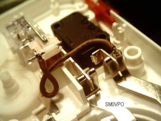 The next step is to connect the coil to the other side of the micro-switch. That's the dark thing in the top of the case. The 60K resistor at the bottom is the return from the coil to the other power terminal. This power terminal is connected from input to output directly.
