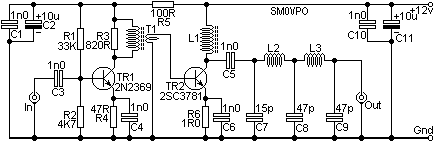 RF is coupled via C3, from the input transmitter to the base of TR1, which is configured as a common-emitter amplifier stage. R1 and R2 sets TR1 DC bias voltage, which is coupled to TR1 base through L1. The emitter resistor, R4, controls the DC operating current of TR1. The output from TR1 is coupled to TR2 by means of a broadband impedance-matching transformer (64:1 step-down).