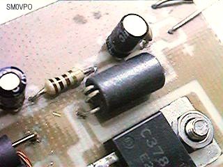 TR1 should really be fitted with a heatsink, but a simple bit of thin tin-plate 1cm x 2cm shaped like "omega" (bent round a drill bit in the vise/vice) can be clipped on the transistor. TR2 did NOT need a heatsink on my prototype, since there is a load of copper under it, but if it has a tendency to cook then take a bit of tin-plate 2cm wide, 4cm long, bent at 90 degrees at 1.5cm and 2.5cm to form a "U" shape. This can be trapped under TR2, but drill a hole to pass the bolt through.
