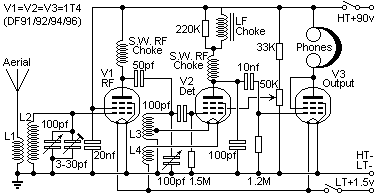 The theoretical diagram is shown above and it will be noted that the reaction is controlled by varying the screen-grid voltage, a method which has a lot in its favour in that it does not affect the tuning to any noticeable degree. The detector anode load is a high-inductance LF choke of some hundreds of Henries and that used by the writer was a pre-war component. It is questionable whether such a choke can be obtained today, but the primary winding of an ordinary inter-valve transformer will serve just as well (I used a 28v PCB relay - Harry). In that case, the secondary can be left disconnected or placed in series with the primary, but care must be taken to see that it is truly in series and not connected in such a way that it reduces the inductance of the primary, which can happen. As with its companion transmitter, all components should be as small as possible consistent with good quality.