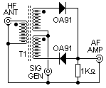 I was intrigued by your HF direct conversion receiver. I am a VLF buff. After thinking about it for awhile, I put together a circuit very much like yours, but using a small radio shack center tapped transformer, 2 1N34 germanium diodes, an audio frequency generator, and a small audio amplifier. Wasn't using much for an antenna, so I didn't expect much. To my surprise, it worked quite well between the frequncies of 15khz to about 60khz. I think it would work better above 60khz with a better antenna. Below 15khz, the LO can be heard, so it's not much use below that. The transformer is an audio center tap transformer that I was using. Further investigation with a scope and the audio generator shows that the degradation above 60khz is a limitation of the transformer itself. However, the receiver works remarkably well between 15khz and 60khz.