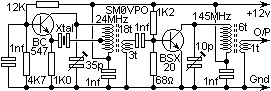 Gives the circuit diagram of a VHF 145MHz oscillator that can be used to receive the 2 meter band. The crystal is a 2-meter 8MHz type (Kenwood 2200) but 12MHz crystals will work equally well in this circuit. If you want to receive 145.750 use a TX crystal from 145.250 - 145.300 (RTTY channel). Tweek the two IF cans (change the IF) to peak the channel required.