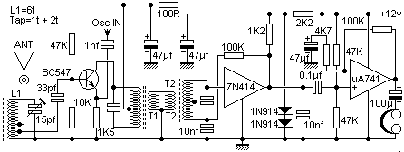 The ZN414 is designed solely for AM but NBFM signals can be copied adequately by off-tuning the receiver a little (slope detection). The ZN414 could also be replaced with the more recent ZN416 IC to provide 18dB more gain. I have left the pin numbers to you as they are readily available in the Maplins (and other) catalogues. The 2 IF transformers are 465KHz coils robbed from another one of those cheap'n-nasty $1.5 radio's.