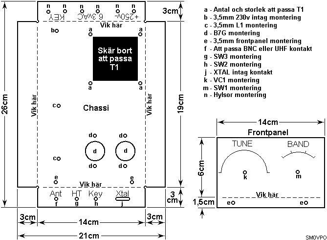 The chassis is built using aluminium plate, drilled as shown above. An extra hole must be added to pass the connection from the PA anode to the tuning coil. If this connection is made using the output coupling capacitor under the chassis then there will be no high DC voltages above the chassis. The mains input terminals must be suitably protected to prevent contact with the mains input. Here is the rear panel of the transmitter. I also mounted sockets for connection to the PSU so that the finished transmitter is also a high voltage PSU for other projects.
