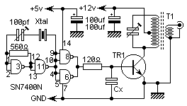 This is a very simple 5 watt CW TX based upon a TTL logic chip. There is just one "tricky" component and this is Cx. This component should have an impedance of about 10 - 50 ohms at the frequency of interest. If you wish to reduce the transmitter power, increase the value of Cx. It is Cx which causes the square wave from the output transistor to approximate a sine waveform. The value of Cx is the price of simplicity in this TX.