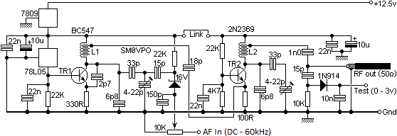 As you can see below, the circuit is basically conventional: it is an oscillator driving a tuned amplifier stage. There's no "rocket science" here! Just a good old two-transistor transmitter, with a bit of thought.