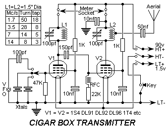 It is customary for newcomers to amateur radio to think in terms of Hammerlund, Hallicrafter and similar receivers and tramsmitters of 100 watts upwards, complete with lines of meters. V.F.O.s and a whole load of other gear; a laudable aim, but not one particularly realisable in these days of short pockets and long prices. As regards the fellow living in the country, even if he is in a position to spend a fair amount of cash on his hobby, all too often he is without electrical power and the cost of operating a normal amateur station from batteries is completely prohibitive-for any ordinary individual, anyway. For the city fellow with little cash, the countryman with no mains, or either of them with little room for a full-sized den of their own, the cigar box transmitter, then is really the answer to a prayer. It will provide a lot of fun at small cost and when the user has finished his "ragchew" on the band, he can close the lid and put the transmitter away in a bureau drawer until the next time! The power, of course, is in relation to the size of the rig; in other words, it is very low, 1 watt to be precise. But if you imagine that 1 watt will not get you anywhere at all, just give this little transmitter a try and you will find that it is quite possible to work DX, even with 1 watt. Given a decent aerial, of course, and having a little regard for the times when the bands are less congested than in the evening or Saturday afternoon.