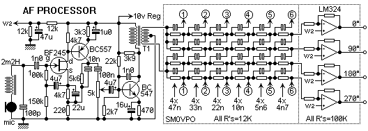 This is a microphone amplifier which is followed by an audio phase - shift network, providing four audio signals. Each audio signal has a phase lag of 90 degrees from the previous output. These four AF signals are required for the balanced modulator which generates the SSB. The original circuit was from the RSGBs VHF/UHF manual but much work has been done to improve performance. Only the microphone pre-amp remains of the original design. The new design generates a four-phase signal that is accurate to well within 1 degree.