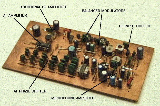 This project generates an SSB signal, on frequency, without the need for crystal filters. Sideband switching is achieved with a single 2-pole changeover switch at AF levels. The input frequency is from a VFO oscillating at 9MHz. The SSB output is the same frequency as the input frequency and may be varied, by up to 10%, without degredation of the SSB generated. Unwanted sideband and carrier are well below 40dB of the wanted sideband. At the frequency of alignment, they may be typically 50-55dB down.