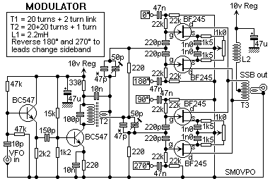 The circuit may also be modified for use with a 5 - 5.5 MHz VFO input which will make this circuit ideal for modifying old CW-only rigs for SSB operation, if the CW rig uses a 5 - 5.5 MHz VFO (Ten-Tec, Heathkit etc.).