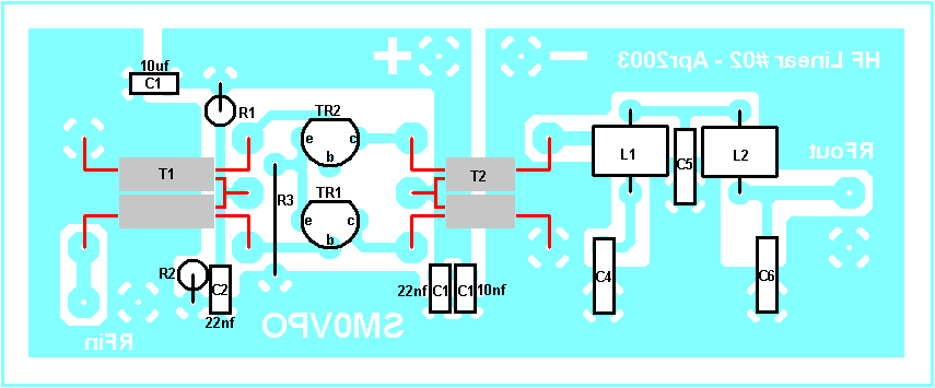 This is the difficult bit. I have already used these circuits as building-blocks for many years, so it is a bit late to start talking about prototypes. So I propose to just "throw together" a prototype 250mW QRP linear amplifier, using Class-AB and include the mandatory low-pass filter on the PCB. The board has sufficient space to add larger ferrites and the transistor pin-spacing allows you to insert TO220 power devices to make that larger 5 Watt amplifier. The TO220's may be mounted below the board, bent over and bolted to a heatsink. This will also support the PCB, but it is a bit fiddly when it comes to positioning the legs and bending them over. You even could modify the artwork a little to use two pairs of BC547 transistors and get 600mW out (T2 secondary = 5 turns).