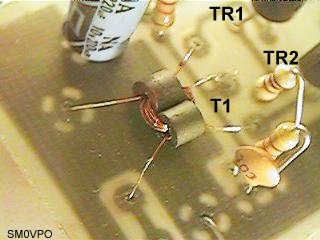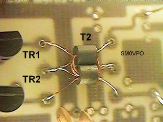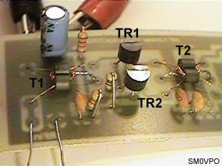 When it is all built it looks something like the photograph below. Here you can see the coil construction quite clearly and that there is loads of space for much larger ferrites than the little tiddley ones I have chosen. The rest of the board is quite well spaced out so there is plenty of room for using larger components than those I chose. This particular photograph, however, is is the same board foil I have provided but the push-pull output also drives another push-pull output stage to give 5 watts out.