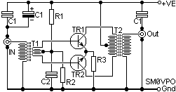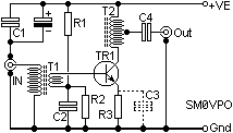 T2 in the 100mW circuit matches the load to the collector of the transistor. When working out the collector impedance FORGET THE DC BIAS. It is only the signal that is of interest. In out 100mW amplifier we had 3.5vRMS at 28mA, so the collector impedance is 3.5/.028 = 125 Ohms. To match 125 Ohms to 75 we need an impedance ratio of 125:75 = 1.7:1 or a step-down turns ratio of 1.3:1. T2 could have two configurations - 8 turns with a tapping at 2 turns from the collector - OR - 8-turns primary with 6-turns secondary.