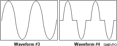 Waveform #3 represents a decent sinewave for comparison, but waveform #4 shows you what happens if the class of bias changes from Class-AB to Class-B and beyond. This particular circuit is efficient, typically 80%, and only dissipates any significant heat during RF activity. This circuit can be used to deliver RF power from 100mW to well over 100-Watts, with suitable choice of components.