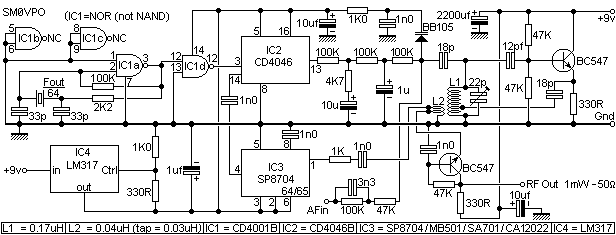 IC1 (CD4001) is the crystal oscillator with an extra gate used as nothing more than a buffer stage. This feeds the frequency comparator of a CD4046 (IC2). The comparator output is filtered with a "slack- handfull" of resistors and caps to feed the VCO; a BC547. A second BC547 has been used to isolate the VCO from the antenna. Without this device the loop would have the tendency to jump out of lock if you touched the antenna. The VCO is also coupled to the divider, IC3, which can be any one of a selection of chips. MB501, SA701, SP8704 and CA12022 are all the same device.
