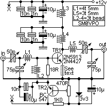 Here we have added TR2 to provide the 0.7vDC bias in the form of a simple series regulator. For driving small transistors like the 2N3866 and 2N4427, TR2 can be a simple BC547 or a 2N2222. For driving higher power amplifiers you should use a larger transistor fitted with a heatsink. A 2N3053 or BCY51 device should be fine. Before switching on the main DC power to the amplifier, set the bias potentiometer to minumum voltage, apply the power and adjust the pot until TR1 draws a little current. For 500mW to 5 watt devices you should set TR1 current to about 5mA to 50mA. With 5 watt to 25 watt amplifiers you should set the TR1 current to about 50mA to 200mA. Don't be to mean with the standing DC current as it is this that is keeping the FCC of your back by giving you a clean transmission (assuming you have a licence). Now you can align the complete Linear PA.