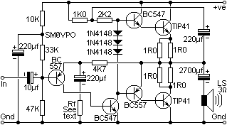 No heatsinking is required for the output transistors when running at a modest output level with either speech or music. A small heatsink should be fitted to the two TIP41 transistors if running a constant tone level. The heatsink could be bolted directly to the TIP41s without electrical isolation if the heatsinks are not going to touch anything. A heatsink with a 15-square surface area is all that is required. Here is the circuit of the amplifer.