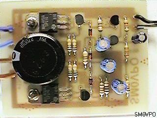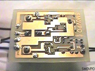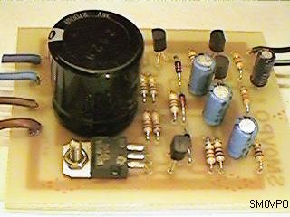 The circuit is very simple and incorporates darlington output transistors that will provide more than enough output current than is needed to drive a 3-ohm speaker. The gain may be pre-set for a variety of input levels, making it suitable for amplifying computer and cassette-deck Line-output levels. The input level is also suitable for use with the TDA7000 receiver. All components are easily available and I will shortly be making this project available as a kit. Naturally, the project will be built on a PCB which will also be available separately. Here is the first PCB, assembled and working.