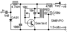 The input only needs to be placed near the transmitter to pick up enough RF to cause it to squeek. With QRP rigs some additional coupling or circuitry may be necessary. The 1.5 volt battery and key can of course be used for CW practice using the same circuit.