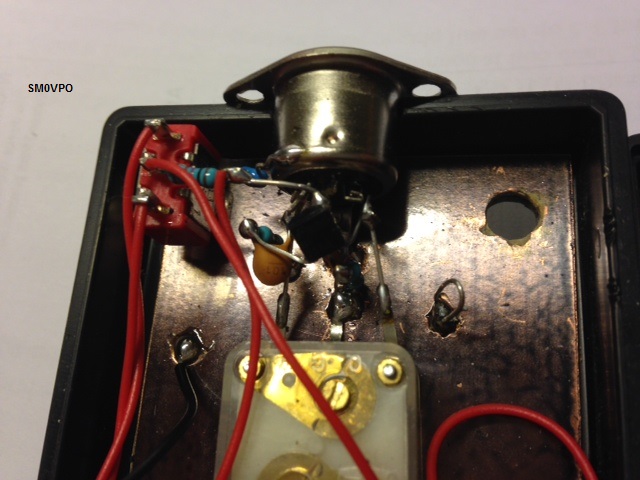 The PCB is held in place after being drilled to take the machine screws to mount the variable capacitor. I used longer M2.5 bolts to hold the capacitor because it also sandwiches the box front plate. Note that the bolts must be so cut that they do NOT go into the capacitor more than about 1.5mm, or they will foul on the brass tuning vanes inside the capacitor.