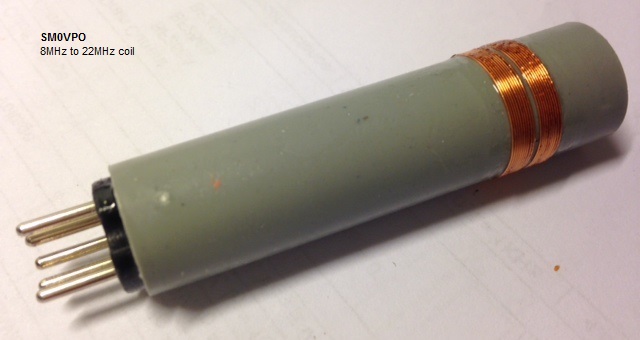 The first coil (above) covers 7.8MHz to 22.1MHz. The coil winding is 15mm Dia., 20 truns (10 + 10) of 0.25mm Dia. enamelled wire, close-wound, with 45mm jumper leads to the socket. The ambient room temperature was 21°C and the relative humidity was nearly 55%. I applied about 300 grams of winding force, and the coil was lightly smothered in super-glue, wiped off with a dry cloth, and I un-glued my finger and thumb using isopropyl alcohol.
