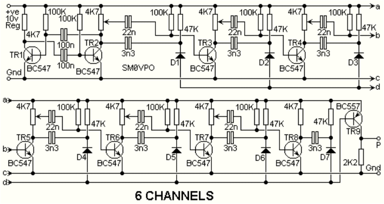 Note that the capacitor marked X should be about 0.47μf. The original prototpe used old capacitors where the tolerance was something like +/- 50%. If the value of this capacitor is too large then it will work on a 2-channel decoder, where the inter-frame delay is long enough to detect and cause the counter to reset. Extending the system to 6-channels can cause the counter reset to fail due to a shorter inter-frame delay. Values as low as 0.3μf will still work.