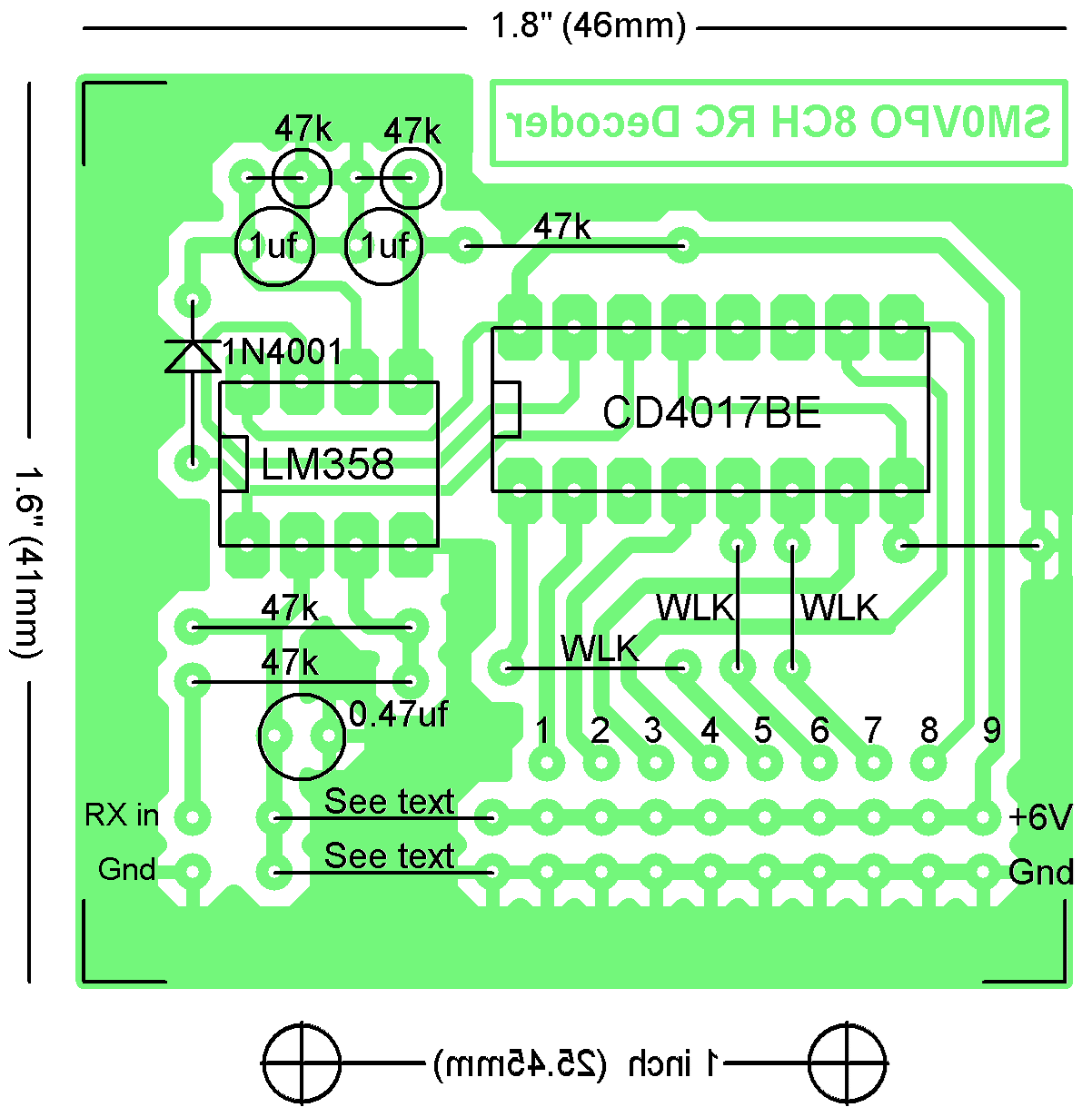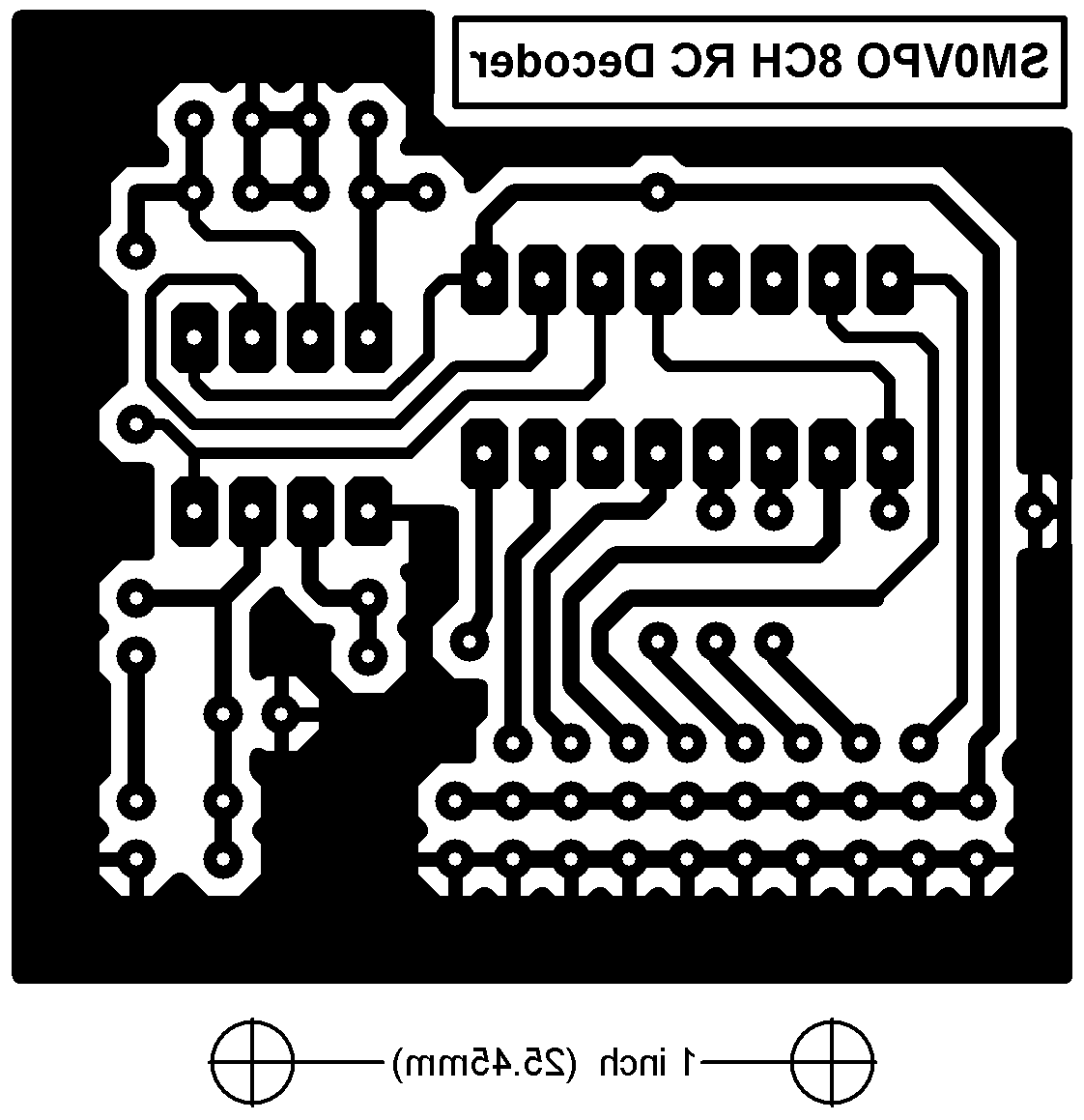 The two resistors marked "See text" are added because of a small problem with the prototype. The input to IC1a and the "voltage follower" capacitor may have a bias to always give a "high" (logic 1). This could be due to microscopic discharge of the X capacitor. The board allows you to add a small amount of DC bias to ensure the output of IC1a is always "low" (0 V) under no-signal conditions. In the prototype a 1MΩ (1-Meg) from the 6 V line was adequate, but you may get a leaky capacitor if, like me, you often choose cheaper components. You can add a 1MΩ from the 6 V line and a 1.5MΩ from the -Ve line to get a more fine adjustment.Here is the Printed Circuit Board foil pattern. The picture resolution of the board is 600 bits per inch, so if you set your print using the printer settings of 600 d.p.i then it will print the perfect size. No NOT rescale the picture or you will loose quality. I have included a 1-inch reference on the board. All the text on the copper should be the correct way round on the PCB. When you print the image to film the toner must be in contact with the photo-resist, so that the image will reverse when you expose and etch. I have reduced the size of the board in this HTML document, but if you right-click and save the image then you will get the full size picture.