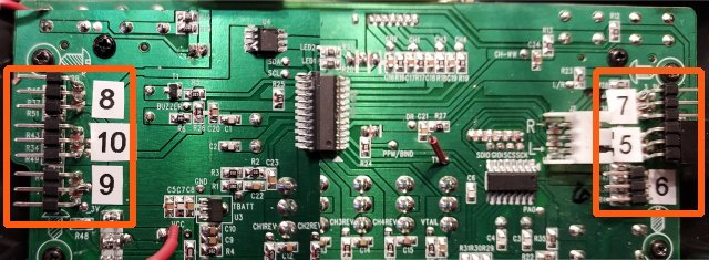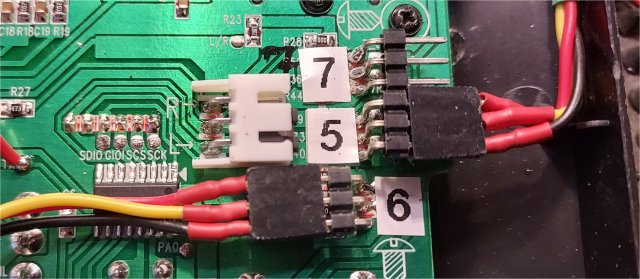 Connecting a 10KΩ potentiometer to the contacts for CH5 to CH10 works immediately. No modifications at all. As you can see I just soldered six 3-pin connectors to the back of the board, so I do not even need to remove the board from the case. To the six connectors I plugged in my six potentiometers. As you can see from the picture above, I didn't have the "special" connectors for additional joysticks, so I used six 3-pole 90° 0.1" headers on the back of the board. There are several advantages to this method, but the main one is accessibility. You can simply reverse a connector to reverse the joystick potentiometer direction, swap or add more channels, without ripping the board out of the unit and risking damage.