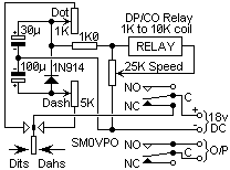 The two electrolytic capacitors determine the dit:dah ratio, but this may be adjusted with the 1K and 5K potentiometers. One word of warning; even modern electrolytic capacitors can have quite a wide tolerance, sometimes from -50% to +100%. A 100uf capacitor can therefore vary from 50 uf to 200 uf!! You may therefore have to "fiddle" with the capacitor values a little each time you build this circuit.