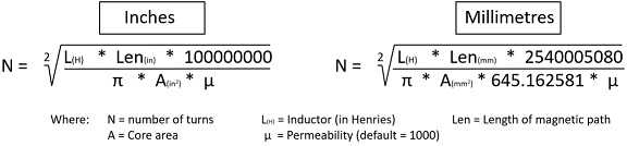 Let us assume we have a load of iron laminations to make a choke, and we need 5 Henries. If you have the data for the incremental AC permeability data (µ) for the laminations, then use this. If you have no data then assuming µ = 1000 is a fairly safe value to use. You also need to know the core area and the core magnetic path length.