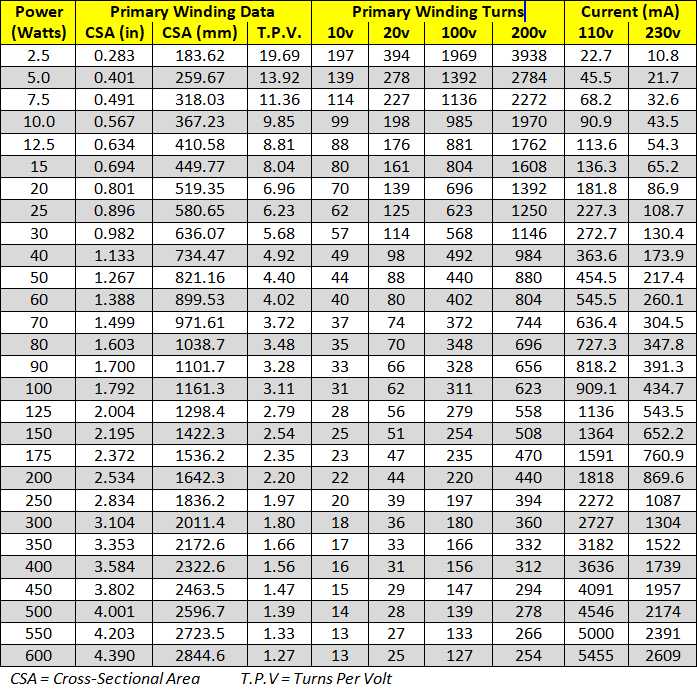 Think about it - a transformer input winding (primary) is the winding that propogates ALL the energy you want to get out of the other windings. The primary winding should therefore occupy 50% of the area budget for ALL the coils. The primary winding should be so dimensioned that it can carry the full primary current. For example, you are to wind a 50-Watt transformer for 250 Volts. The current in the primary will be 50W / 250V = 200mA. From table 1 you can see that you need to make the winding with a minumum of 0.3mm Diameter wire (212mA). For me this is a little close for comfort, so I normally increase the wire size to almost fill the available area. For example, 240V * 5 turns/volt = 1200 turns. Using 0.3mm diameter wire will use 108mm². My budget is 266mm², more than twice this. If I increase the wire diameter to 0.4mm then it will use 192mm² of the 266mm² budget. 0.4mm diameter will also take up to 377mA. This will also reduce the total resistance of the wire and give you better voltage regulation.